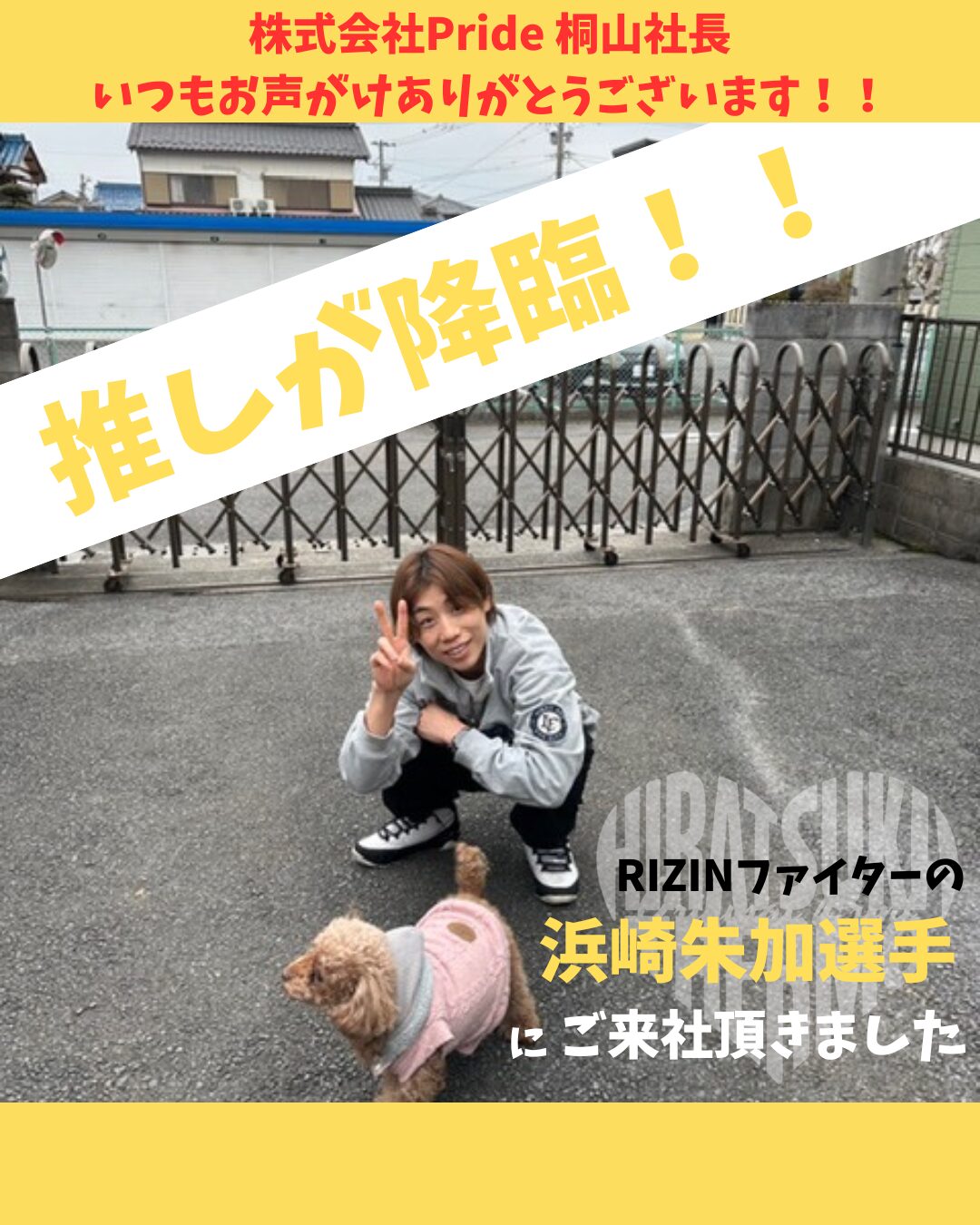 いつもお世話になっております株式会社Prideの桐山社長がRIZINファイターの浜崎朱加選手を弊社へお連れくださいました!